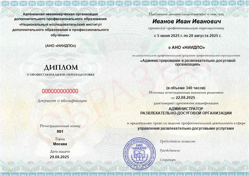 Подготовить квалифицированных администраторов развлекательно-досуговой организации, способных обеспечить клиентам компании насыщенный и полноценный отдых, является главной задачей данной программы. Вы познакомитесь с правовым обеспечением сферы развлекательных услуг, деловым общением, принципами медиации, основами управления, способами продвижения предлагаемых мероприятий. Узнаете об особенностях работы развлекательной компании, перспективных технологиях и способах обеспечить стандарты качества обслуживания в области развлекательных услуг.