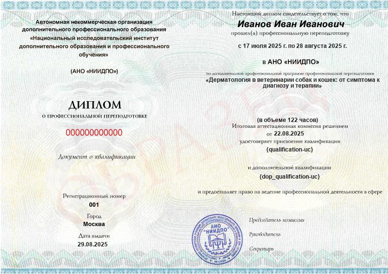 Выпускникам, успешно прошедшим итоговую аттестацию по дополнительным профессиональным программам, выдается документ о квалификации - диплом о профессиональной переподготовке или удостоверение о повышении квалификации. В соответствии с приказом Минобрнауки России от 24.03.2025 № 266 «Об утверждении Порядка организации и осуществления образовательной деятельности по дополнительным профессиональным программам», документ о квалификации выдается на бланке, образец которого самостоятельно устанавливается образовательной организацией.