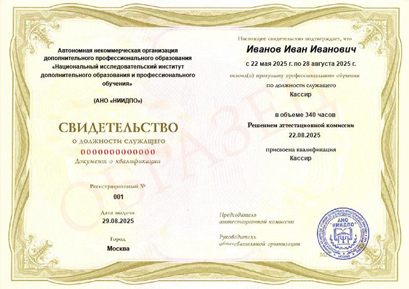 - Документ о квалификации: свидетельство о должности служащего установленного образца