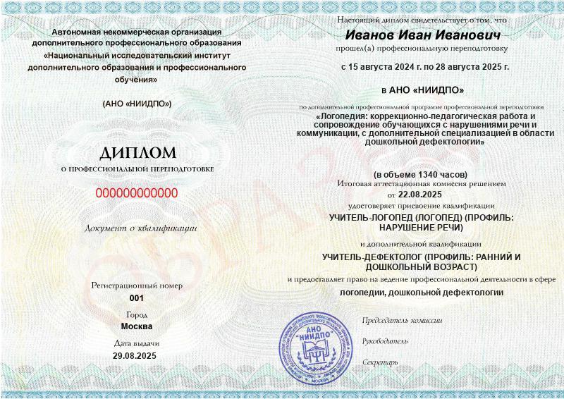 - 2 квалификации: Учитель-логопед (логопед) (профиль: нарушение речи) + Учитель-дефектолог (профиль: ранний и дошкольный возраст)