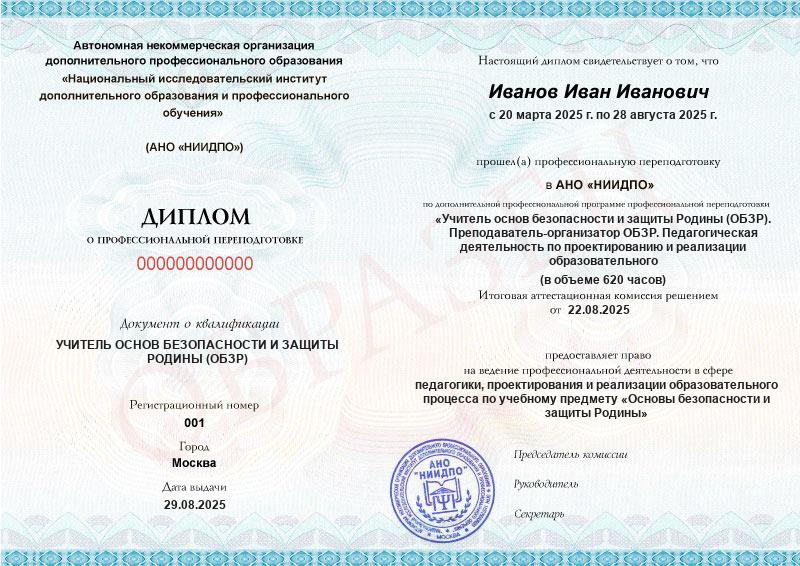 - 2 квалификации: УЧИТЕЛЬ ОСНОВ БЕЗОПАСНОСТИ И ЗАЩИТЫ РОДИНЫ (ОБЗР) + ПРЕПОДАВАТЕЛЬ-ОРГАНИЗАТОР ОБЗР