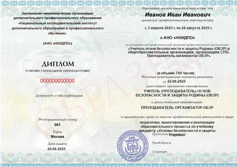 • 2 квалификации: Учитель (преподаватель) основ безопасности и защиты родины (ОБЗР) + Преподаватель-организатор ОБЗР