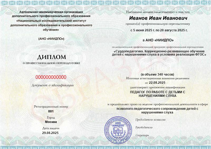 • Квалификация: Педагог по работе с детьми с нарушениями слуха