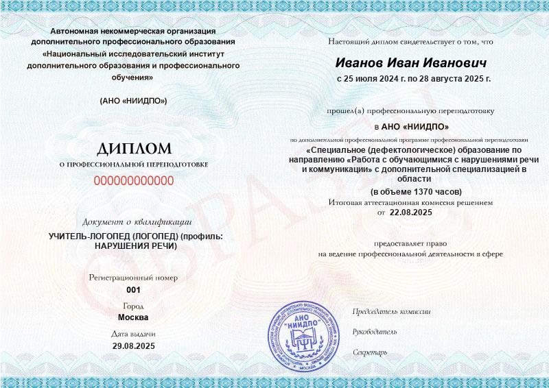 Специальное (дефектологическое) образование по направлению «Работа с обучающимися с нарушениями речи и коммуникации» с дополнительной специализацией в области нейропсихологии (1370ч)
